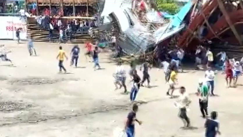 भिडियो फुटेजमा एल एस्पिनल रंगशालामा दर्शकहरूले भरिएको तीन तले काठको स्ट्यान्ड खसेको देखिन्छ ।