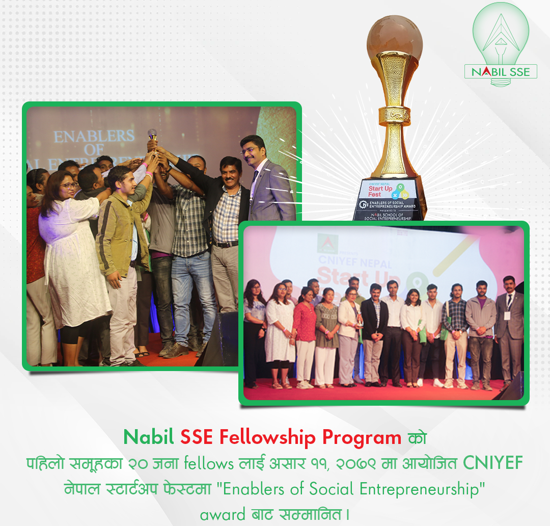 CNIYEF Nepal ले असार ११ गते काठमाडौंमा आयोजना गरेको CNIYEF Nepal StartUp Fest 2022 मा ‘नबिल सामाजिक उद्यमशिलता’ कार्यक्रम अन्तर्गत पहिलो ब्याचका २० जना सहभागिहरुलाई सामूहिक रुपमा सो अवार्ड प्रदान गरेको हो ।