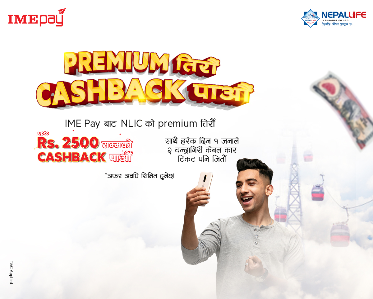 आइएमई पे एपको “प्रिमियम तिरौँ, क्यासब्याक पाऔँ” अफर अन्तर्गत असार १० गते देखि सो एपबाट एन.एल.आइ.सि.को बीमा किस्ता भुक्तानीमा ग्राहकहरुले सो मूल्यको ०.५% (अधिकतम रु. २,५०० सम्म) क्यासब्याकको साथै हरेक दिन १ बिजेताले २ चन्द्रागिरी केबलकार टिकट जित्न मिल्ने व्यवस्था मिलाइएको छ ।