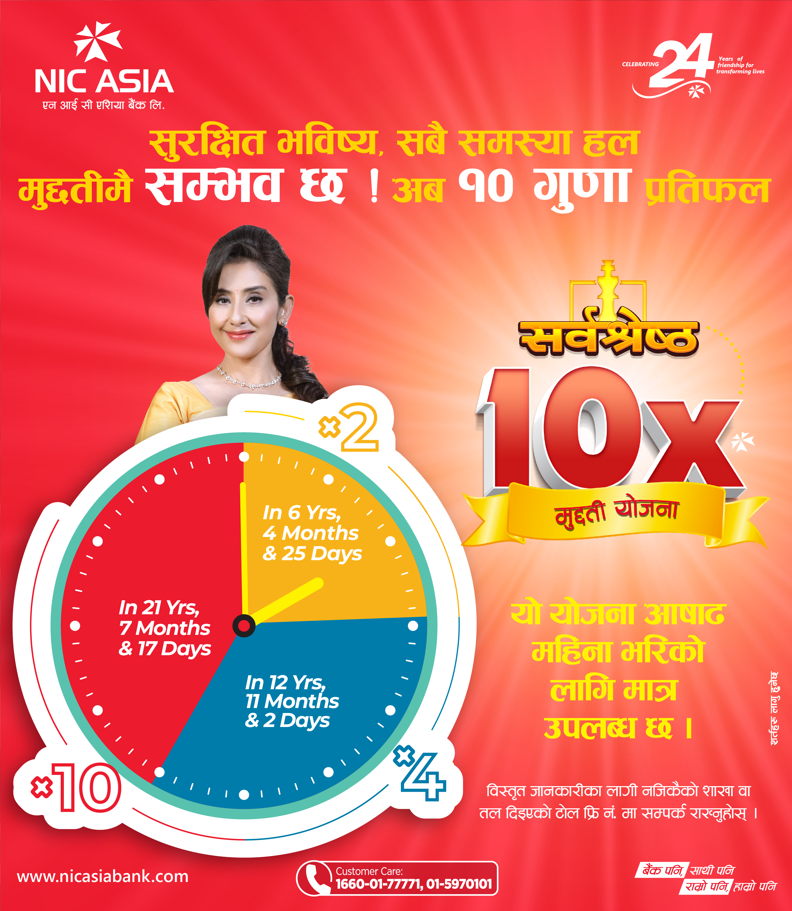 काठमाडौ । देशको दुरदराजमा रहनुभएका लाखौं ग्राहकहरू माझ सहज, सबल, गतिशील, विश्वसनीय र उत्तरदायी बैंकिङ्गको अभ्यास गर्दै आइरहेको एन आई सी एशिया बैंकले आषाढ १२ गते देखि निक्षेप रकमको १० गुणा रकम फिर्ता हुने सर्वाधिक उच्च ब्याजदर सहितको नवीनतम ‘एन आई सी एशिया सर्वश्रेष्ठ १० गुणा मुद्दती योजना’ सार्वजनिक गरेको छ ।