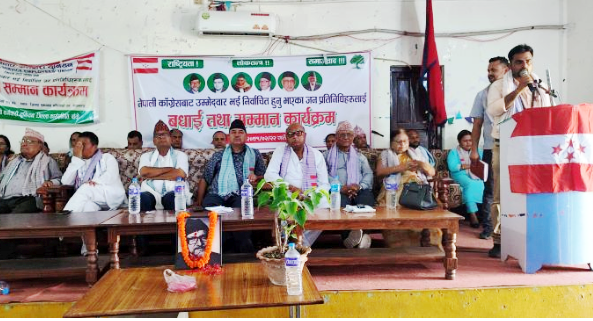 नेपाली कांग्रेस बाँकेका सभापति नारायणप्रसाद गौडेलको सभापतित्व एवम् केन्द्रीय सदस्य तथा पूर्वमन्त्री सञ्जय कुमार गौतमको प्रमुख आतिथ्यतामा सम्पन्न बधाई तथा सम्मान कार्यक्रममा केन्द्रीय सदस्य गौतम, केन्द्रीय सदस्य मैकुलाल बाल्मिकी, लुम्बिनी प्रदेश सभापति अमरसिंह पुन, जिल्ला सभापति गौडेल लगायत अन्य अतिथिहरुले नवनिर्वाचित जनप्रतिनिधिहरुलाई टिका र खादा लगाएर सम्मान एवं बधाई र शुभकामना दिएका थिए ।