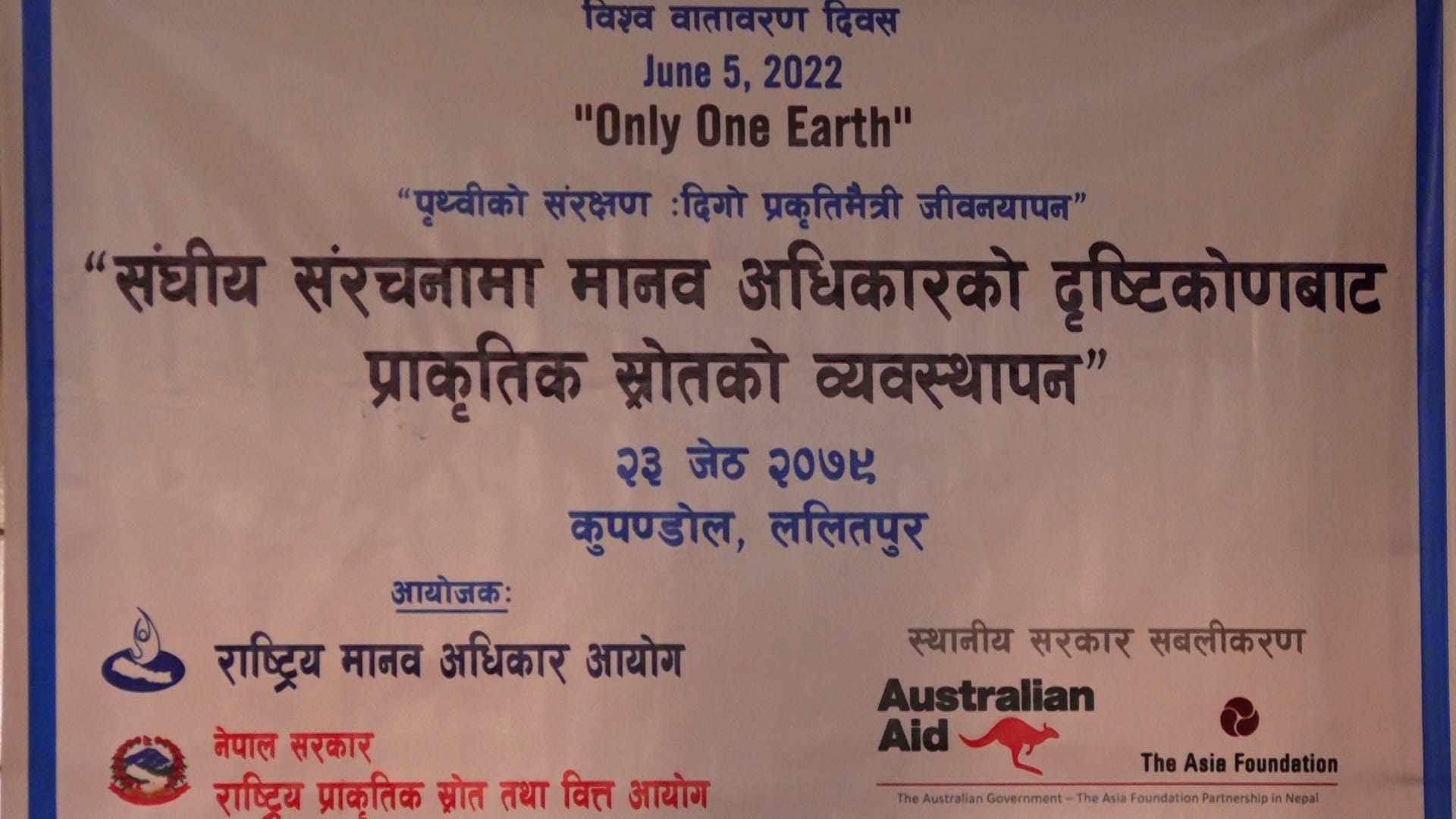 ‘संघीय संरचनामा मानवअधिकारको दृष्टिकोणबाट प्रकृतिक स्रोतको व्यवस्थापन’सम्बन्धी अन्तत्र्रिmयामा सहभागी विज्ञहरूले मुलुकको प्राकृतिक स्रोतको व्यवस्थापनमा समस्या उत्पन्न हुने र त्यसको व्यवस्थापनमा तीन तहको सरकार चुकेको भन्दै त्यसको व्यवस्थापन गर्न आह्वान गरे । ‘पृथ्वीको संरक्षण, दिगो प्रकृतिमैत्री जीवनयापन’ भन्ने राष्ट्रिय नारा तथा ‘वान्ली वान अर्थ’ भन्ने विश्वव्यापी नाराका साथ विश्वभर वातावरण दिवस मनाइएको हो ।