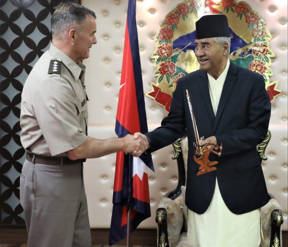 काठमाडौं । अमेरिकी सेनाको एसिया प्रशान्त क्षेत्रका कमान्डिङ जनरल चाल्र्स ए। फ्लिनले प्रधानमन्त्री शेरबहादुर देउवासँग शिष्टाचार भेट गरेका छन् ।