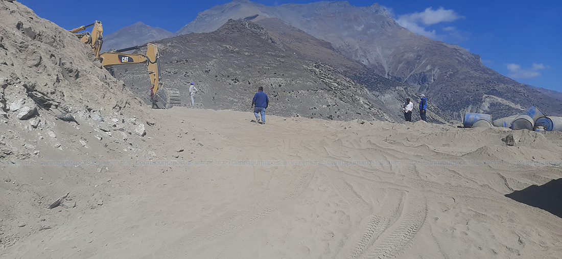 दुई वटा एक्साभेटर ९डोजर०ले अहिले सडकको मार्ग खन्ने काम गरिरहेका छन् । केही दिनमै ग्याबियन पर्खाल निर्माण गर्न थप मजदुर परिचालन गरिने प्रतिनिधि रोकायले बताए । समुद्री सतहदेखि चार हजार मिटरभन्दा बढीको उचाइमा सडक निर्माण भइरहेको छ । मुस्ताङतर्फबाट डोल्पाको सिमाना याकखर्कसम्म सडक पु¥याउन लागिएको हो । डोल्पातर्फबाट मुस्ताङको सिमाना नजिकसम्म सडक जोडिएको छ ।