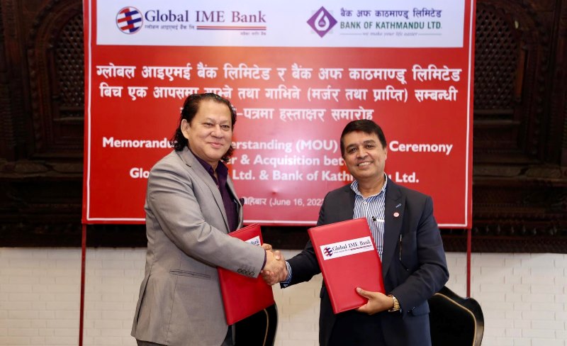 बराबरीको हैसियतमा गर्न लागिएको मर्जरको समझदारीपत्रमा ग्लोबल आइएमई बैंकका अध्यक्ष चन्द्रप्रसाद ढकाल र बैंक अफ काठमाण्डूका अध्यक्ष प्रकाश श्रेष्ठले हस्ताक्षर गरेका छन्।