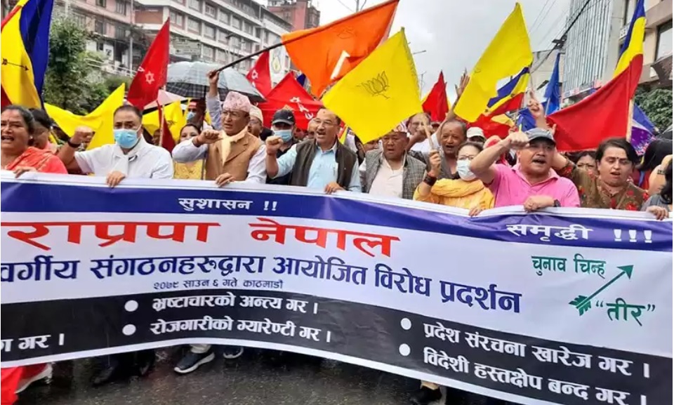 काठमाडौं । कमल थापा नेतृत्वको राप्रपा नेपालका जनवर्गीय संगठनहरूले प्रदेश संरचना खारेजीलगायतका माग राख्दै संयुक्त रुपमा काठमाडौँमा विरोध प्रदर्शन गरेका छन् । शुक्रबार अध्यक्ष कमल थापासमेत उपस्थित माइतीघरबाट सुरु भएको सो प्रदर्शनमा सो पार्टीका सबै जनवर्गीय संगठनहरूको उपस्थिति छ ।