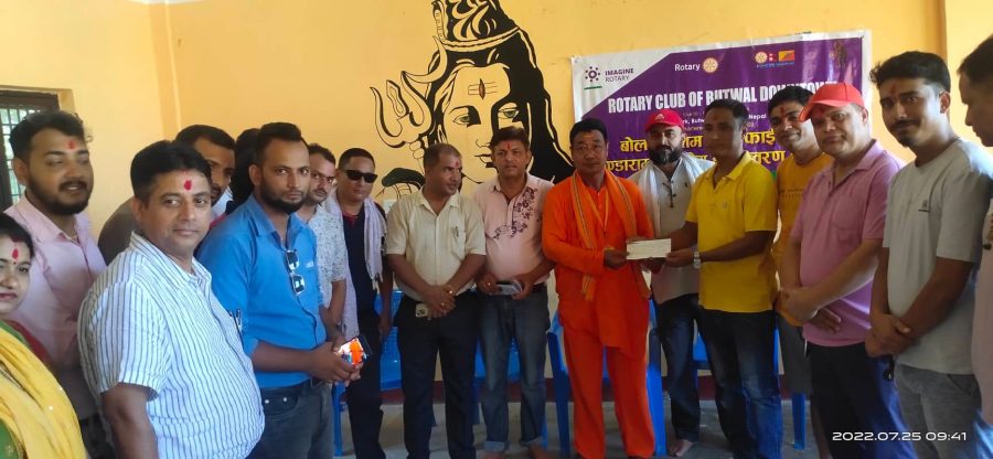 बुटवल । पश्चिमको पशुपतिको रुपमा पहिचान बनाएको स्वयंम उत्पत्तिमान परोर्हा परमेश्वर धाम मन्दिरमा साउन मेलाको भण्डाराका लागि रोटरी क्लब अफ बुटवल डाउनटाउनसहित संघसंस्थाहरुले आर्थिक सहयोग गरेको छ । सोमबार मन्दिर परिसरमा विशेष पुजाआजासहितको कार्यक्रममा परोर्हा परमेश्वर धाम विकास समितिका अध्यक्ष राम वली चौधरी, सैनामैना वडा नं ४ का वडाअध्यक्ष राम प्रसाद अधिकारीलाई डाउनटाउनका क्लबका अध्यक्ष भरत रानाले एघार हजार एक सय एघार रुपैया रकम हस्तान्तरण गरेको हुन ।