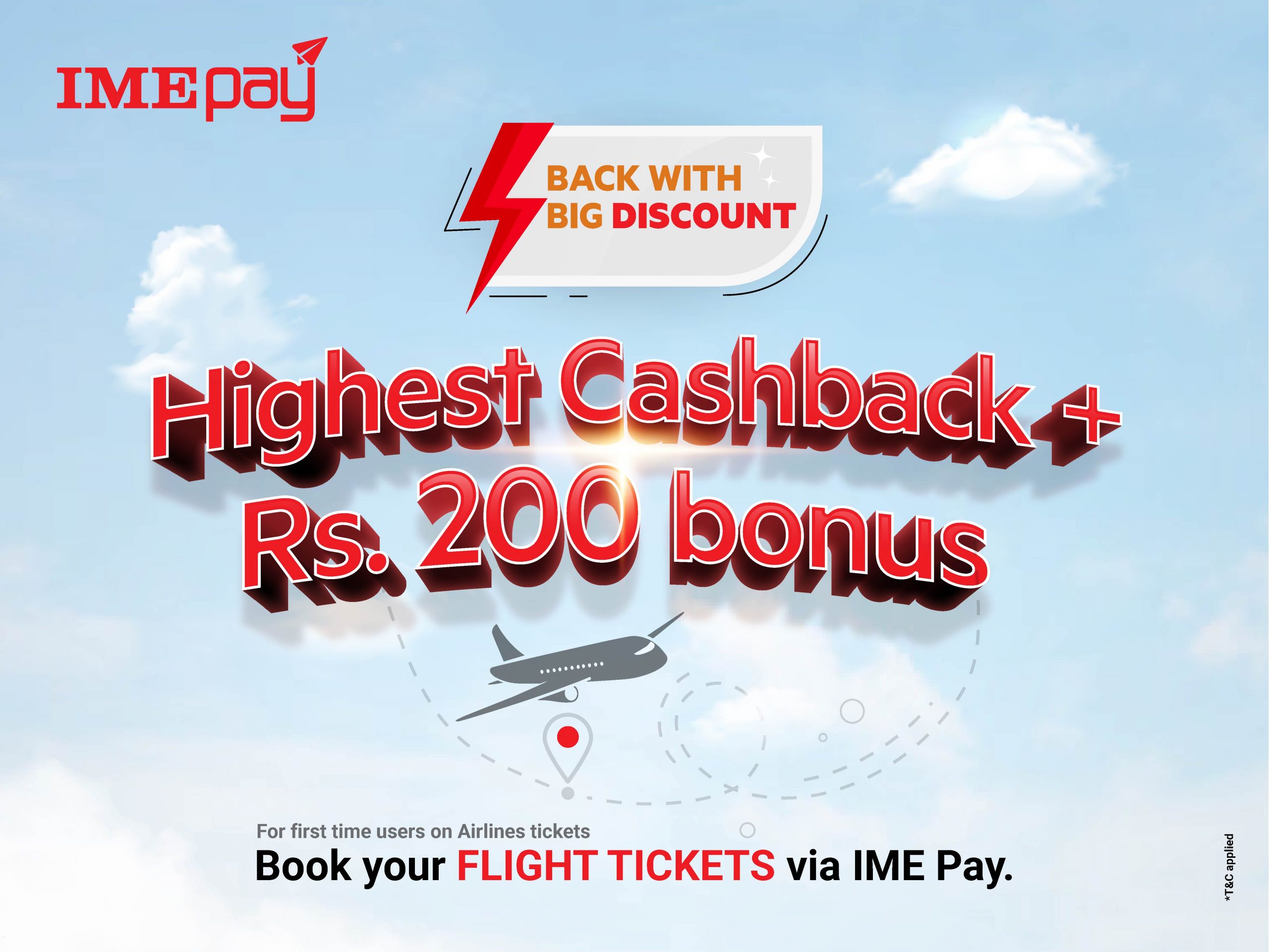 पहिलो पटक आइएमई पे एप प्रयोग गर्ने ग्राहक वा पहिलो पटक आइएमई पे एपबाट हवाइ उडान टिकट काट्ने ग्राहकहरुले आइएमई पे एप मार्फत हवाइ उडान टिकट काट्दा सर्वाधिक क्यासब्याकको साथै अतिरिक्त रू.२०० बोनस पनि प्राप्त गर्ने गरी स्किम तयार गरिएको छ ।