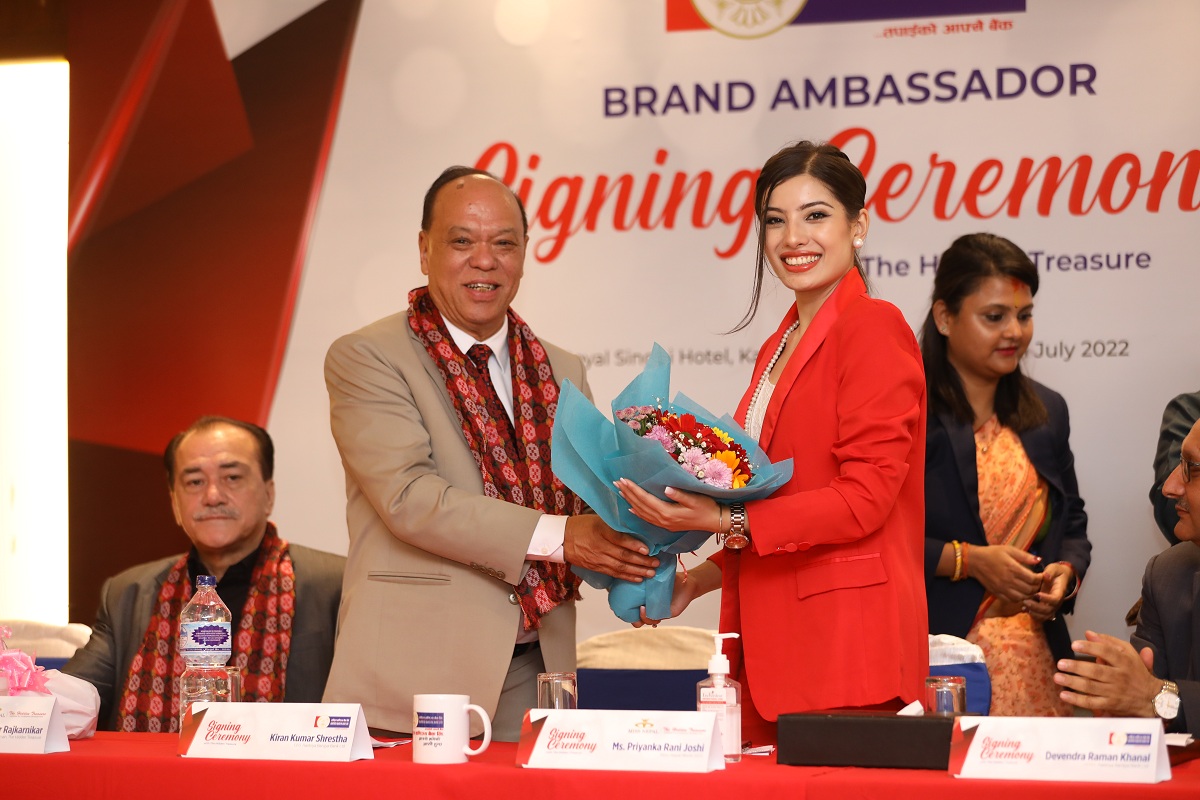 बैंक र दी हिडन ट्रेजर प्रा.लि. बिच भएको सम्झौतामा बैंकको तर्फबाट प्रमुख कार्यकारी अधिकृत किरणकुमार श्रेष्ठ र दी हिडन ट्रेजर प्रा.लिको तर्फबाट अध्यक्ष दीवाकर राजकर्णिकारले हस्ताक्षर गरी मिस नेपाल वल्र्ड–२०२२ प्रियंका रानी जोशीलाई ब्राण्ड एम्बासडरमा नियुक्त गरेका हुन् ।