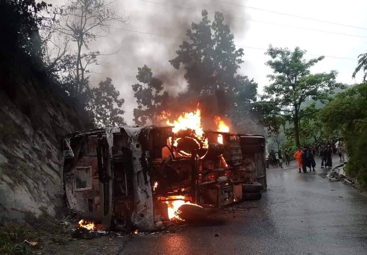 कञ्चनपुरबाट काठमाडौंका लागि छुटेको ना ५ ख ५१०० नम्बरको बस आफैँ अनियन्त्रित भई सडक छेउमा पल्टिदा बसमा आगो लागेको नवलपुर प्रहरी प्रमुख डिएसपी सन्तोष पाठकले जनाकारी दिए । उनका अनुसार बसमा ३१ जना जना सवार थिए ।