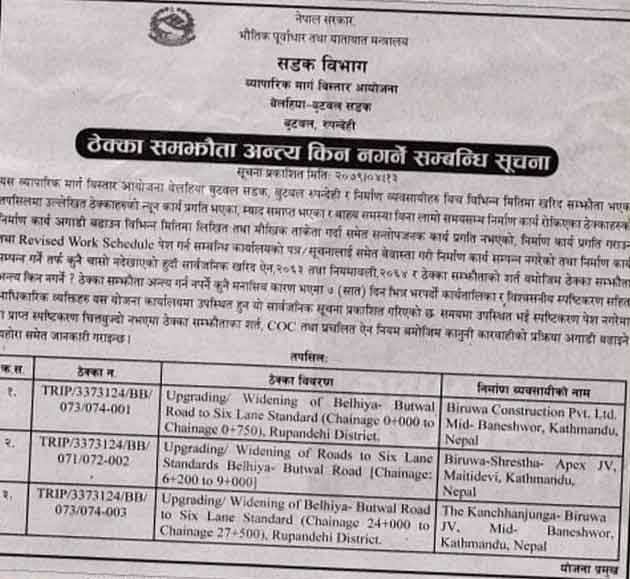 व्यापारिक मार्ग विस्तार आयोजनाले प्रकाशित गरेको सूचनामा बेलहिया–बुटवल सडकले बुटवल सडकको न्यून कार्य प्रगति भएको, म्याद समाप्त भएका र बाह्य समस्याविना पनि लामो समयसम्म निर्माणको कार्य रोकिएको उल्लेख छ । सो ठेक्का सम्झौता अन्त्य गर्न नपर्ने कुनै मानासिव कारण भए सात दिनभित्र भरपर्दो स्पष्टीकरणसहित आयोजनाको कार्यालयमा उपस्थित हुन भनिएको छ । स्पष्टीकरण चित्तबुझ्दो नभएमा ठेक्का सम्झौताका शर्त र सिओसी तथा प्रचलित ऐन, नियमअनुसार कानुनी कारबाही अगाडि बढाउने आयोजनाको भनाइ छ ।