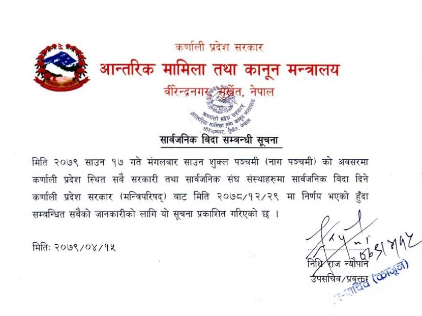 ‘साउन १७ गते मंगलबार साउन शुक्ल पञ्चमी अर्थात् ‘नाग पञ्चमी’ को अवसरमा कर्णाली प्रदेशस्थित सबै सरकारी तथा सार्वजनिक संघ संस्थाहरूमा सार्वजनिक बिदा दिने कर्णाली प्रदेश सरकार ‘मन्त्रिपरिषद्’बाट मिति २०७८ चैत २९ मा निर्णय भएको हुँदा सम्बन्धित सबैको जानकारीका लागि यो सूचना प्रकाशित गरिएको छ’ मन्त्रालयका प्रवक्ता उपसचिव निधिराज न्यौपानेद्वारा हस्ताक्षरित सूचनामा उल्लेख छ ।