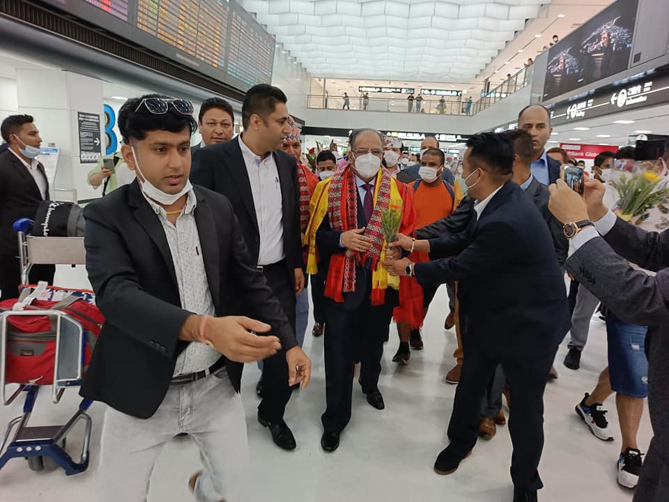 विमानस्थलमा स्वागत गर्नेहरुमा एनआरएनए अन्तराष्ट्रिय समन्वय परिषदका उपाध्यक्ष रोविन्द श्रेष्ठ, भूषण घिमिरे, एनआरएनए जापानका वरिष्ठ उपाध्यक्ष नवीन निउरे, मंचका पदाधिकारीहरू, मंचका केन्द्रीय समितिका सदस्य, विभिन्न नेपाली संघ संस्थाका प्रमुख तथा प्रतिनिधिहरू, सर्वसाधारण नेपालीहरू रहेका थिए ।