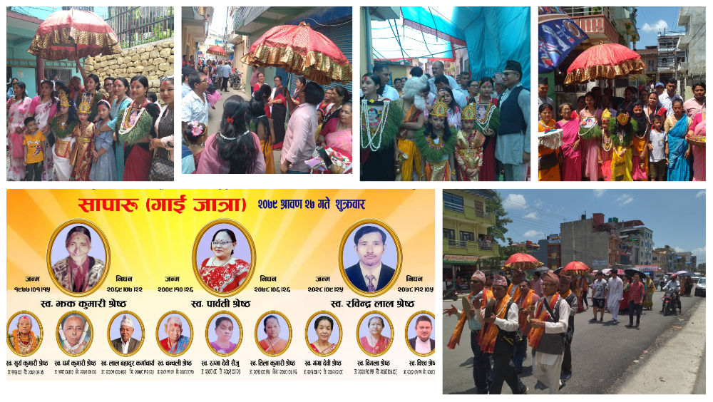 बुटवल । आफ्ना १२ जना सदस्यहरुको मृत्यु भएको स्मरणमा नेवाः सेवा समिति बुटवलले गाईजात्रा (सापारु) लिकालिएको छ । यस वर्ष बितेका समितिका १२ जना सदस्यहरुको स्मरणमा समितिको अगुवाईमा गाईजात्रा निकालिएको छ ।