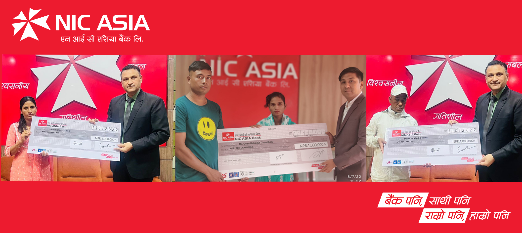 काठमाडौ । एन आई सी एशिया बैंकले सर्वश्रेष्ठ बचत खाता योजना अन्तर्गत बैंकका विभिन्न शाखामा बचत खाता खोलेका ३ जना ग्राहकको दुर्घटनामा परि मृत्यु भएकाले उनीहरुको परिवारलाई बीमा वापत प्रतिव्यक्ति रू १० लाखको दरले कुल रू ३० लाख बीमा रकम भुक्तानी गरेको छ ।