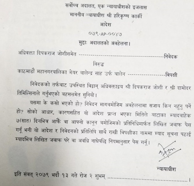 अधिवक्ता दीपकराज जोशीले बालेनविरुद्ध दायर गरेको अदालतको अवहेलना मुद्दामाथि सोमबार सुनुवाइ गर्दै न्यायाधीश हरिकृष्ण कार्कीको एकल इजलासले बाटाको म्यादबाहेक सात दिन भित्र आफैं वा आफ्ना प्रतिनिधिमार्फत लिखित जवाफ पेस गर्न आदेश दिएको हो ।