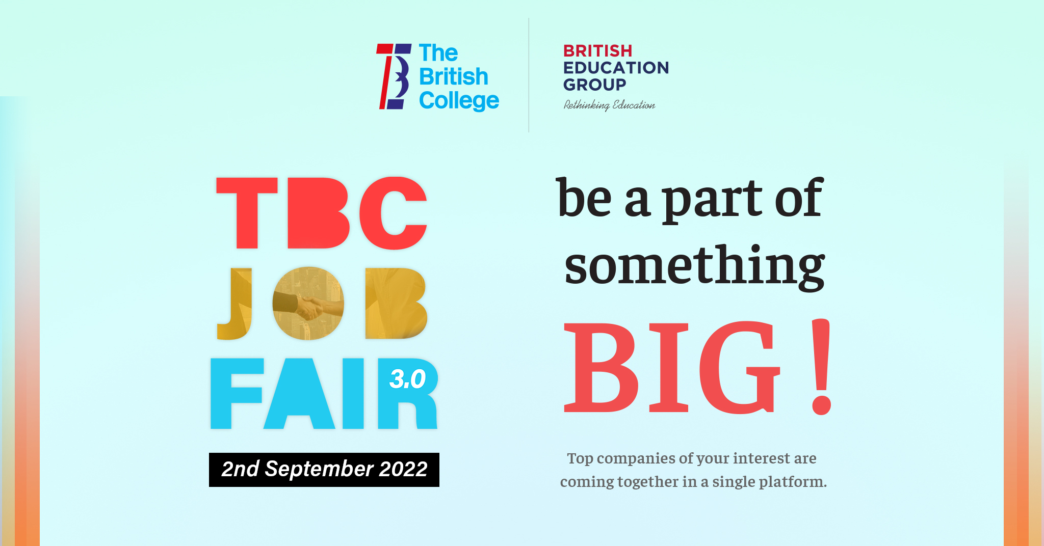 काठमाडौ । काठमाडौँको थापाथलीस्थित ‘द ब्रिटिस कलेज’ (टीबीसी)ले ‘टीबीसी जब फेयर ३.०) को आयोजना गर्ने भएको छ । कलेजले थापाथलीस्थित आफ्नै भवनमा आउँदो सेप्टेम्बर २ मा तेस्रो जब फेयरको आयोजना गर्न लागेको हो ।
