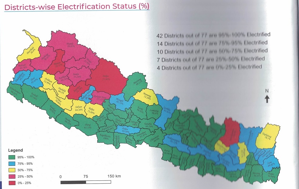७७ जिल्लामध्ये ४२ जिल्लामा पूर्ण विद्युतीकरण भएको छ । झापा, मोरङ, सुनसरी, धनकुटा,सप्तरी, सिराहा, धनुषा,महोत्तरी, सर्लाही, रौतहट, बारा, पर्सा,रामेछाप, दोलखा,कार्भेपलाञ्चोक, सिन्धुपाल्चोक, काठमाडौं, भक्तपुर र ललितपुर सारभूत रुपमा विद्युतीकरण भएका जिल्लाहरु हुन् ।