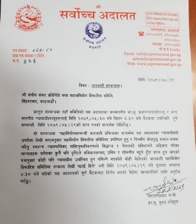 महाभियोगसम्बन्धी कारबाही प्रक्रियाका सन्दर्भमा यस अदालतका न्यायाधीशले उपरोक्त लेखी आएअनुसार महाभियोग सिफारिस समितिमा उपस्थित हुनु र निजसँग सोधपुछ, सवाल-जवाफ गरिनु स्वतन्त्र न्यायपालिका, शक्तिपृथकीकरणको सिद्धान्त र नेपालको संविधानले अङ्गिकार गरेका मान्यताहरू समेतका कुनै पनि दृष्टिले संविधानसम्मत् उचित र शोभनीय नहुने हुँदा प्राप्त हुन आएको पत्रानुसार कोही पनि न्यायाधीश उपस्थित हुन नमिल्ने भएकोले सोही व्यहोराको जानकारी महाभियोग सिफारिस समितिमा तत्काल लेखी पठाइदिने निर्णय बैठकले गरेको हो ।