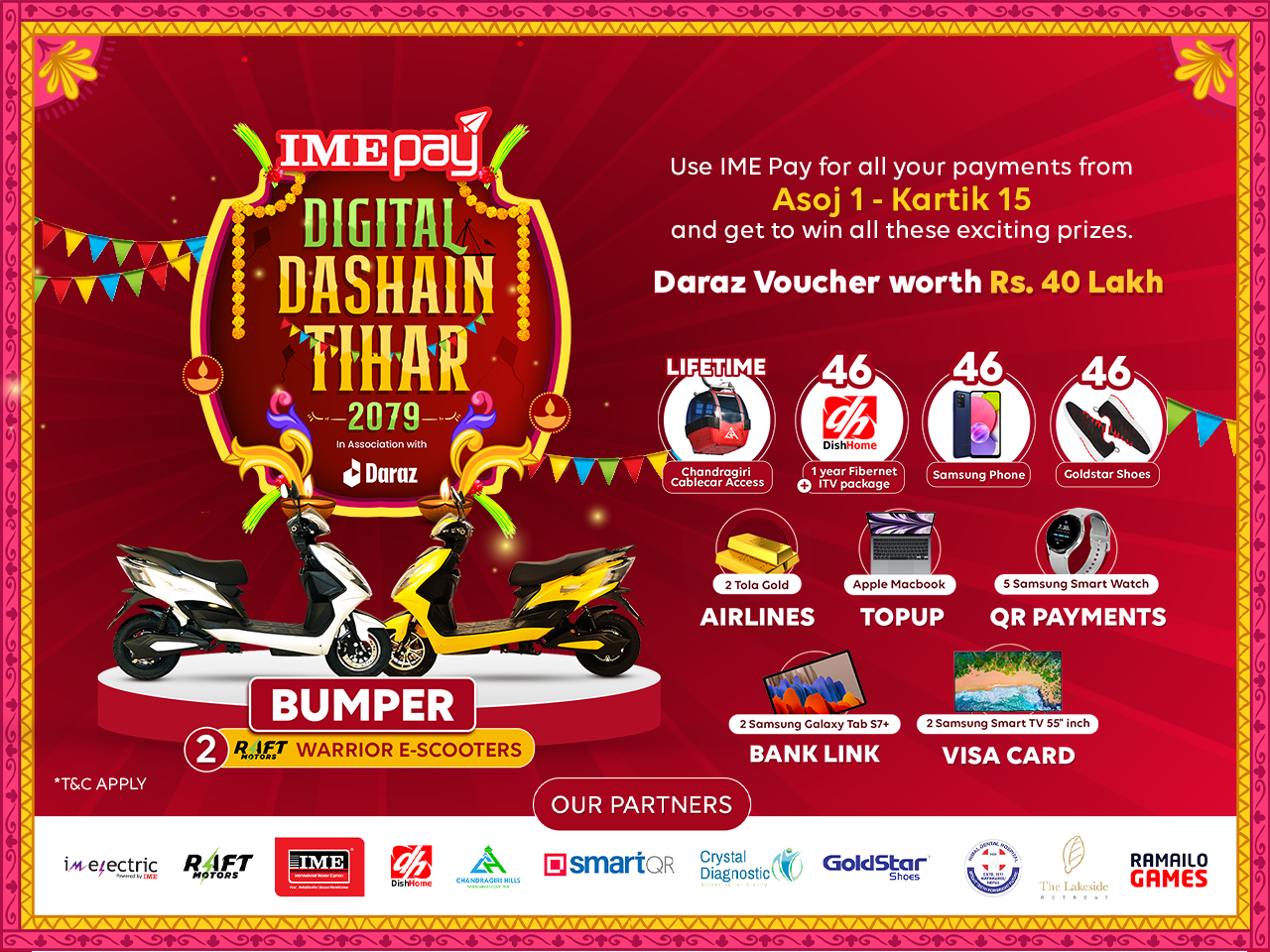 काठमाडौ । महान चाड, दशैं, तिहार तथा छठको पावन अवसरमा नेपालको पहिलो भुक्तानी सेवा प्रदायक, आइएमई पेले पहिलो पटक भव्य स्तरमा आइएमई पे डिजिटल दशैं तिहार २०७९ अफर सार्वजनिक गरेको छ । उक्त अफर २०७९ साला आश्विन १ गते देखि कार्तिक १५ गतेसम्म जम्मा ४६ दिनसम्म कायम हुनेछ ।