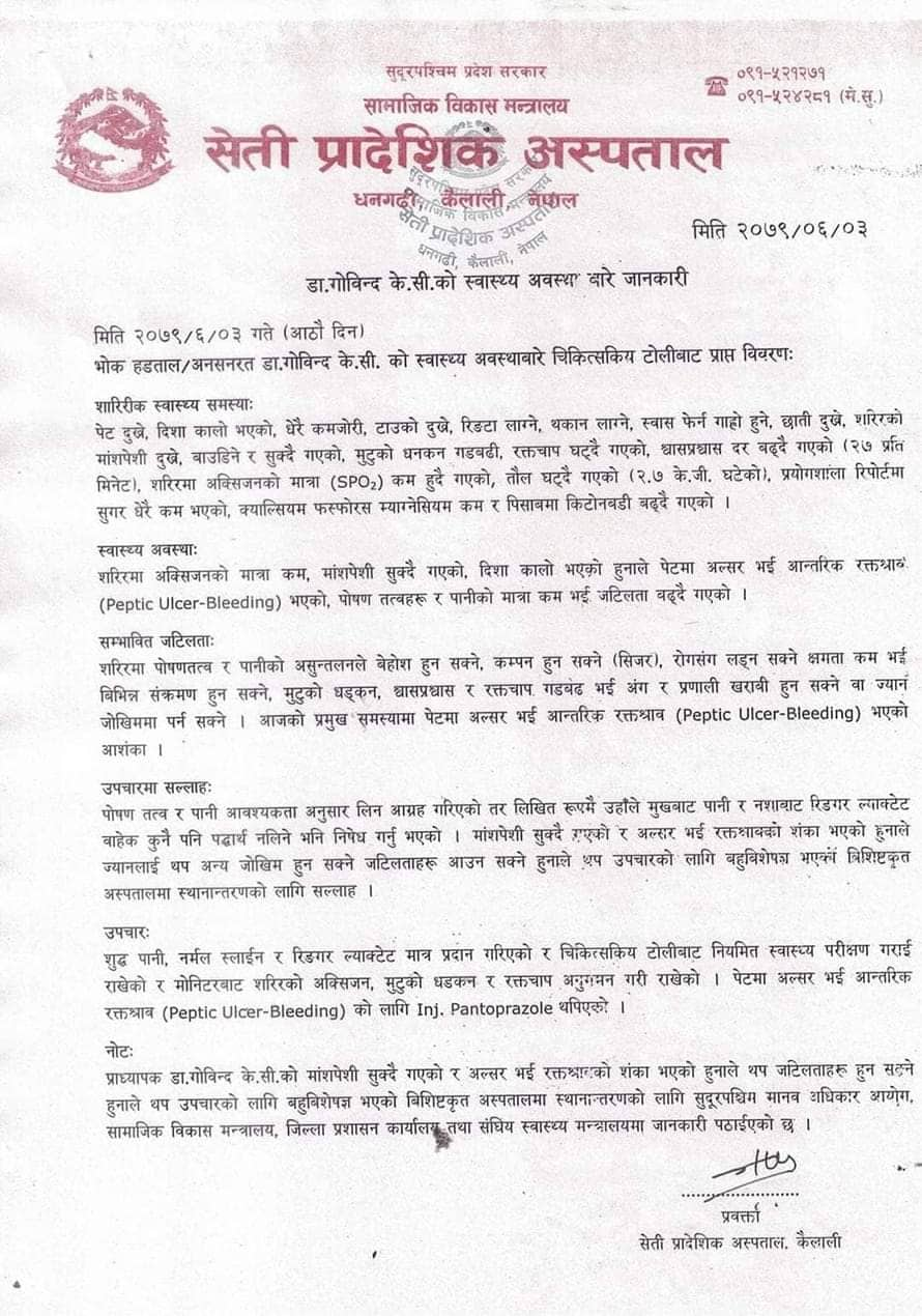 सेती प्रादेशिक अस्पतालले भन्यो- डा. केसीलाई बहुविशेषज्ञ अस्पतालमा लैजाऊ, जीवन रक्षा गर्न संघको माग