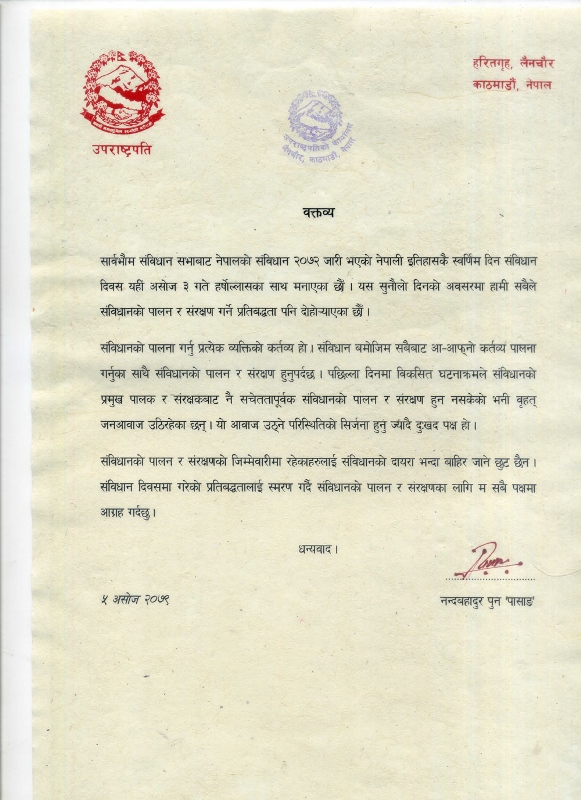 उपराष्ट्रपति पुनले संविधान दिवसमा गरेको प्रतिवद्धतालाई स्मरण गर्दै संविधानको पालना र संरक्षणका लागि सबै पक्षलाई आग्रह गरेका छन् ।