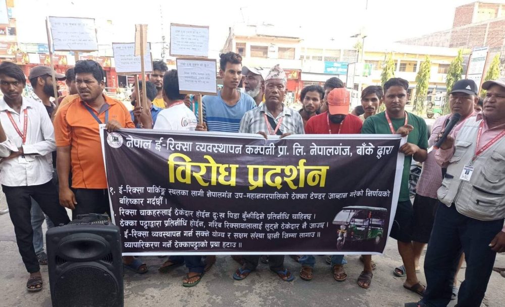 नेपालगञ्ज उपमहानगरपालिकाले पार्किङस्थलको लागि आव्हान गरेको टेण्डर प्रक्रियालाई रद्द गर्नुपर्ने माग राखेर रिक्सा चालकहरुले आज प्रदर्शन गरेका थिए । नेपाल ईरिक्सा व्यवसायी कम्पनी प्राली नेपालगन्जको आह्वानमा ईरिक्सा चालकहरु प्रदर्शनमा उत्रिएका थिए ।