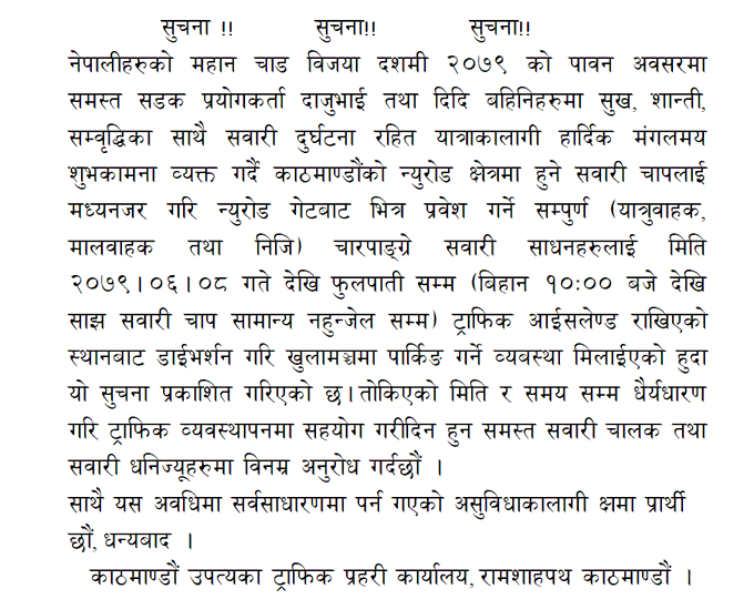 काठमाडौं उपत्यका ट्राफिक प्रहरी कार्यालयका अनुसार आजदेखि फूलपातीसम्म यो व्यवस्था लागु गरिएको हो ।
