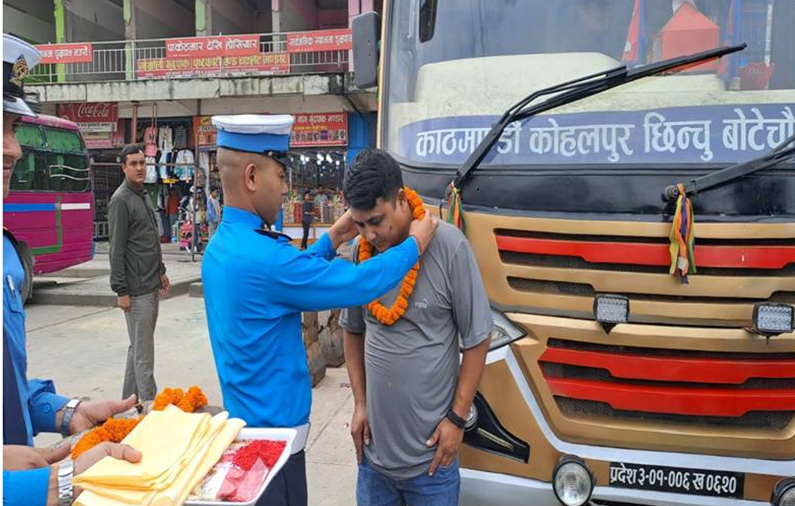 सचेत भएर सवारी चलाउने सचेतना सहित फुलमाला लगाइदिएर काठमाडौं बसपार्कबाट बिदाई गरि पठाईएको काठमाडौ उपत्यका ट्राफिक प्रहरी कार्यालयका प्रहरी नायब उपरीक्षक सन्तोष रोकाले जानकारी दिए ।