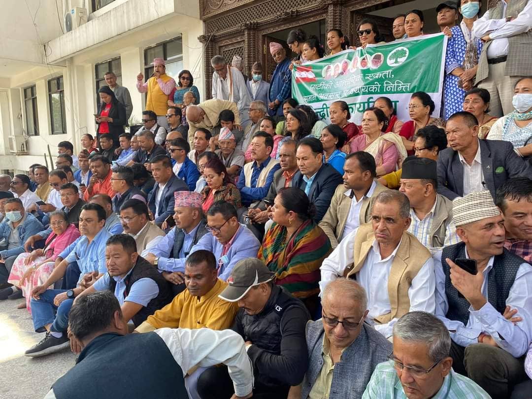 काठमाडौं । सानेपास्थित कांग्रेस केन्द्रीय कार्यालयमा बुधबार फरक दृश्य देखिन्थ्यो । ब्यानर बोकेर कांग्रेस नेता नै धर्ना बसेका थिए । सबैको एउटै स्वर थियो, ‘हामी पार्टीभित्र न्याय मागिरहेका छौं। अन्याय सहँदैनौं भनेर विरोध स्वरूप धर्नामा बसेका हौं ।’