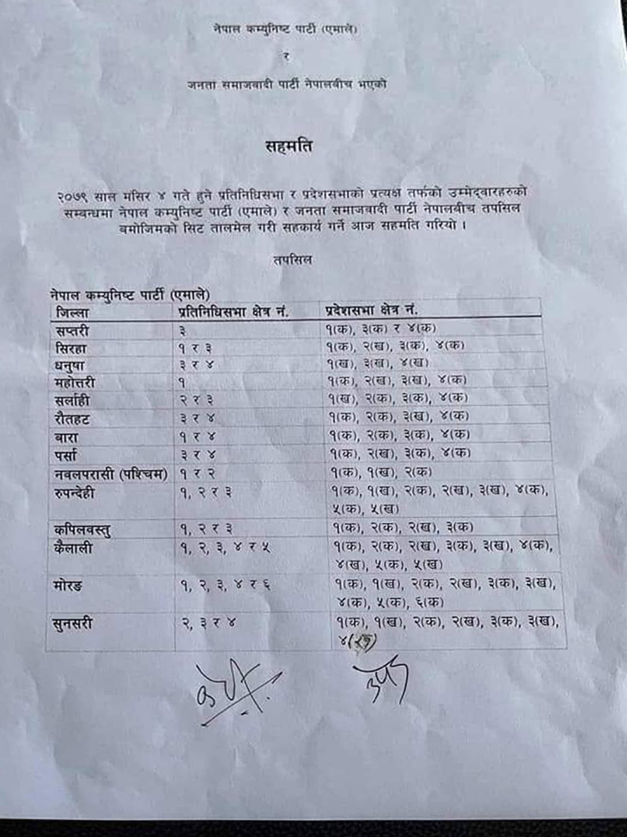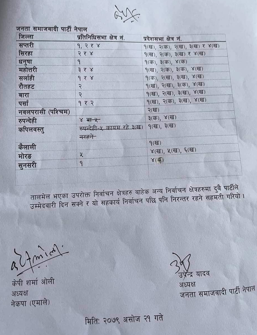 सिट बाँडफाँटसम्बन्धी सहमतिपत्रमा एमाले अध्यक्ष ओली र जसपा अध्यक्ष यादवले हस्ताक्षर गरेका छन् ।