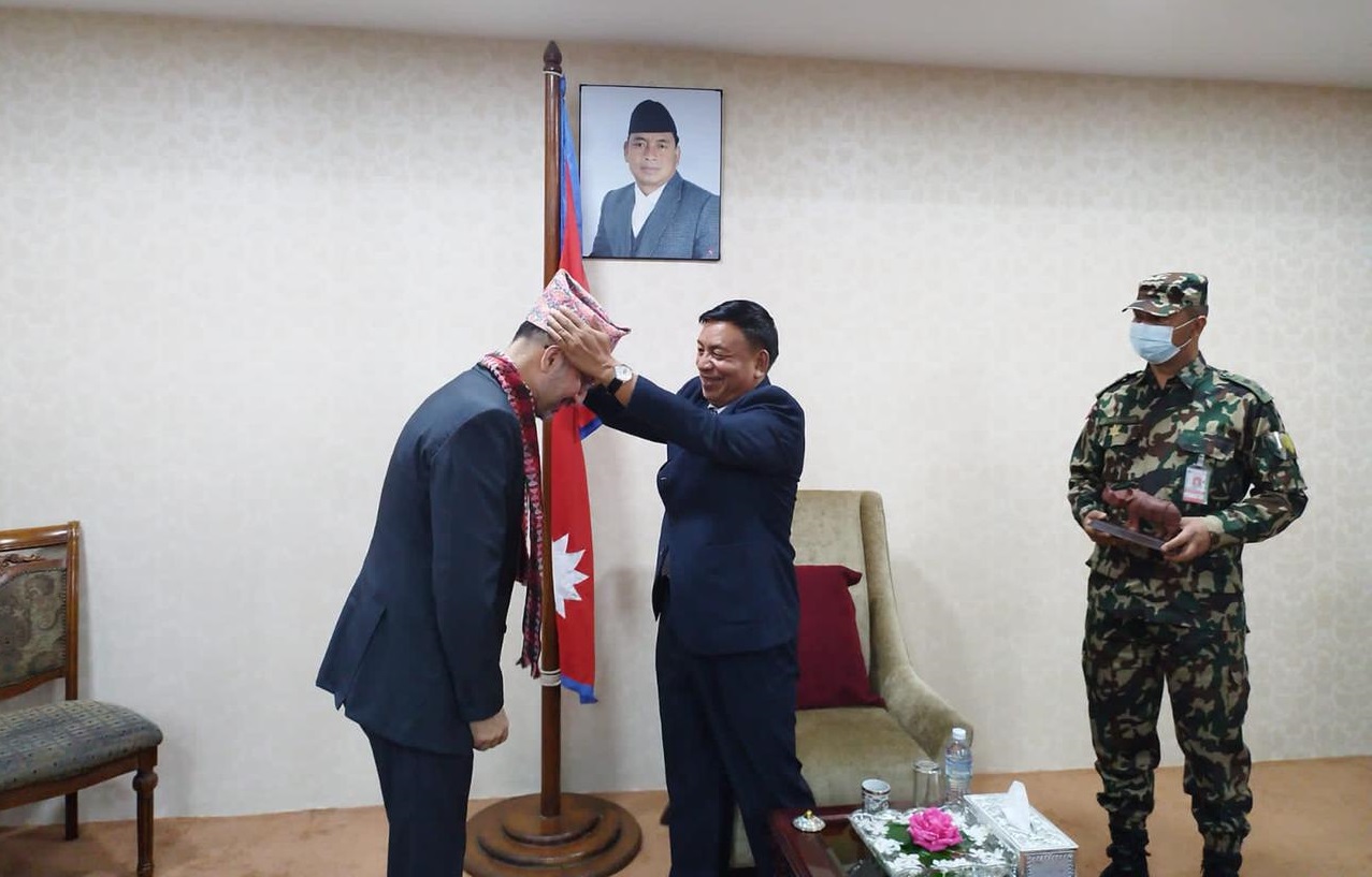 भेटमा उपराष्ट्रपति पुनले राजदूतलाई नेपाली ढाका टोपी र खादाले सम्मान गरेका थिए ।