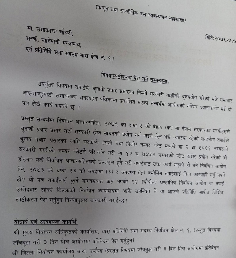 चुनाव प्रचार–प्रसारमा सरकारी गाडी दुरुपयोग गरेको उजुरीका आधारमा उनलाई आयोगले स्पष्टीकरण सोधेको हो ।