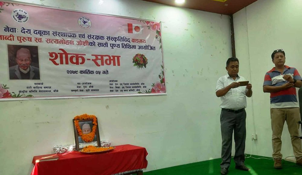 नेपालगन्ज । शताब्दी पुरुष सत्यमोहन जोशीको स्मरणमा नेपालगन्जमा शोकसभाको आयोजना गरिएको छ । नेवाः दय दबु सहित नेपालगन्जमा क्रियाशिल साहित्य तथा भाषागत संस्थाहरुको आयोजनामा जोशीको निधनमा शोकसभाको आयोजना गरिएको हो ।