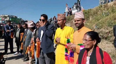 काठमाडौं । डडेल्धुरामा प्रतिनिधिसभा सदस्यमा स्वतन्त्र उम्मेदवारी दिएका सागर ढकाल प्रधानमन्त्री एवं कांग्रेस सभापति शेरबहादुर देउवाको स्वागत गर्न मालासहित लाइनमा बसेका छन् ।