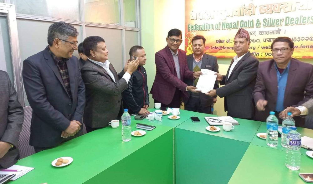 त्यसैगरि सुनको आपुर्तिको दिर्घकालिन समाधानको लागि कोटा प्रणलीको अन्त्य र व्यबसायीहरुको आवश्यकता अनुसार सहज रुपमा सुन किन्न सक्ने व्यवस्था मिलाउन राज्य संग अबिलम्ब पहल गर्ने र लामो समय देखि थाति रहेको सुनचाँदी व्यबसाय सम्बन्धि नियमावली तथा निर्देशिका पारित गर्ने कुरामा गम्भिर रुपमा लाग्नुपर्ने ज्ञापनपत्र मार्फत आग्रह गरिएको छ ।