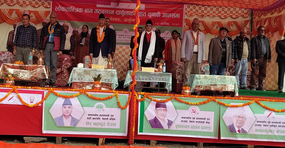 आज दार्चुलाको गोकुलेश्वरमा सत्ता गठबन्धनको चुनावी सभालाई सम्बोधन गर्दै प्रधानमन्त्री देउवाले नेकपा (एमाले)का अध्यक्ष केपी शर्मा ओलीले आफूले मात्रै पास गरेको जस्तो गरेर झुटा कुरा गरिरहेको आरोप लगाए ।