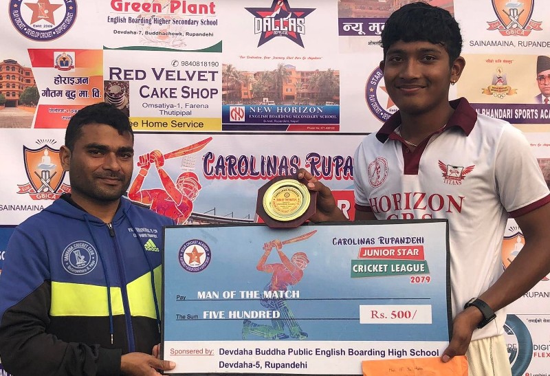 बुटवल । देवदहमा जारी कारोलिनास रुपन्देही जुनियर स्टार क्रिकेट लिग २०७९ अन्तरगत शनिबार भएको खेलमा तिलोत्तमा टाईटन विजयी भएको छ । स्टार क्रिकेट एकेडेमीको आयोजनामा देवदहस्थित क्रिकेट मैदानमा भएको खेलमा तिलोत्तमाले बुटवल युनाईटेडलाई ९५ रनले पराजित गरेको हो ।