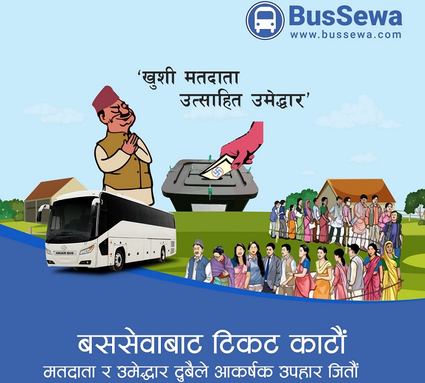 काठमाडौं । नेपालमा अनलाइन मार्फत बस टिकटिङ्ग सेवा प्रदान गर्दै आएको बससेवा डटकमले आगामी आइतबार हुन लागेको प्रतिनिधिसभा र प्रदेश सभाको निर्वाचनमा घर जान लागेका मतदातालाई लक्षित् गर्दै विशेष अफर सार्बजनिक गरेको छ ।