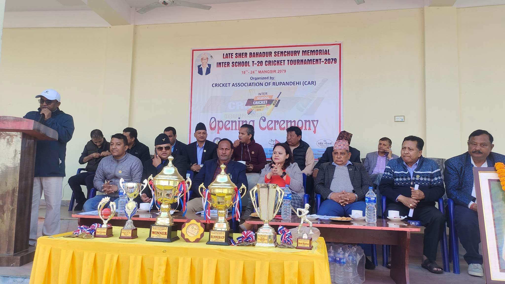 भैरहवा । रुपन्देहीको भैरहवामा आइतबारदेखि स्व.शेरबहादुर सेन्चुरी मेमोरियल अन्तरविद्यालय स्तरीय टी–२० क्रिकेट प्रतियोगिता सुरु भएको छ । रुपन्देही क्रिकेट संघको आयोजनामा सुरु प्रतियोगिताको उद्घाटन खेलमा एभरेष्ट बोर्डिङ स्कूल बुटवलले साइग्लोबल एकेडेमीलाई ९ विकेटले पराजित गर्दै विजयी सुरुवात गरेको छ ।