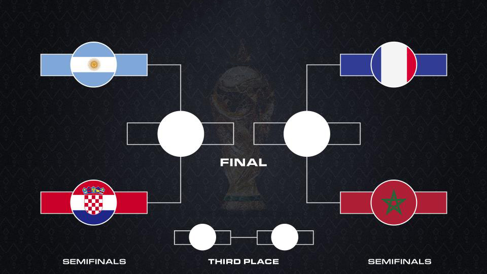सेमिफाइनल खेलहरु बुधबार र बिहिबार राति हुनेछन् । पहिलो खेलमा अर्जेन्टिना र क्रोएसियाबीच प्रतिस्पर्धा हुँदा दोस्रो खेलमा फ्रान्स र मोरक्कोबीच भिडन्त हुनेछ । दुबै खेल राति पौने एक बजे सुरु हुनेछ ।