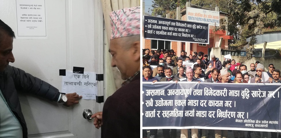 महासंघले औधोगिक क्षेत्र व्यवस्थापन लिमिटेडमा आज तालाबन्दी गरेको हो । असमान अन्यायपुर्ण तथा विभेदकारी भाडाबृद्धि खारेज गर, सबै उद्योगमा एकल भाडा दर कायम गर, वार्ता र सहमतिमा नयाँ भाडा दर निर्धारण गर भन्ने माग महासंघको रहेको छ ।