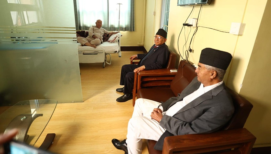 काठमाडौं । नेकपा एकीकृत समाजवादीका अध्यक्ष माधवकुमार नेपाललाई भेट्न प्रधानमन्त्री शेरबहादुर देउवा र माओवादी केन्द्रका अध्यक्ष पुष्पकमल दाहाल प्रचण्ड एक सँगसँगै अस्पताल पुगेका छन् ।