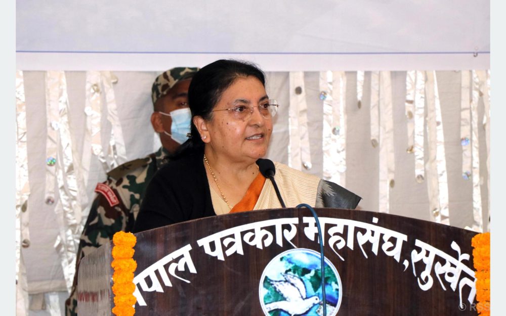 कर्णाली प्रदेशको राजधानी सुर्खेतको बीरेन्द्रनगरमा आज आयोजित नेपाल पत्रकार महासङ्घको साधारणसभा उद्घाटनमा बोल्दै राष्ट्रपति भण्डारीले मुलुकको व्यवस्था परिवर्तनका विभिन्न आन्दोलनमा पत्रकारिता जगतले महत्वपूर्ण योगदान पु¥याएको बताइन् ।