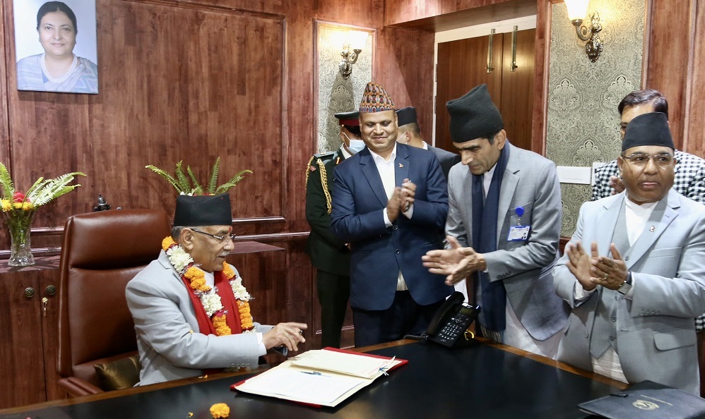 काठमाडौं । प्रधानमन्त्री पुष्पकमल दाहाल प्रचण्डले पदभार ग्रहण गरेका छन् । सोमबार साँझ सिंहदरबारस्थित प्रधानमन्त्री तथा मन्त्रिपरिषद्को कार्यालय पुगेर प्रचण्डले पदभार ग्रहण गरेका हुन् । प्रकाशित मिति : ११ पुस २०७९, सोमबार ८ : ०२ बजे