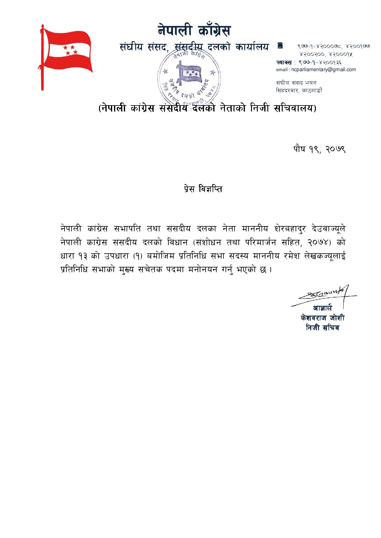 देउवाका विश्वास पात्र लेखक कञ्चनपुर ३ बाट निर्वाचित भएका हुन् । अझै दलको उपनेता र सचेतक मनोनीत गर्न बाँकी छ ।