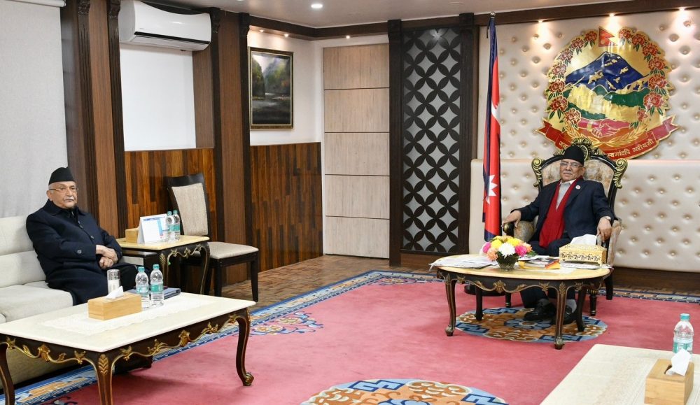 काठमाडौं । प्रधानमन्त्री प्रचण्ड र नेकपा (एमाले)का अध्यक्ष केपी शर्मा ओलीबीच भेटवार्ता भएको छ ।