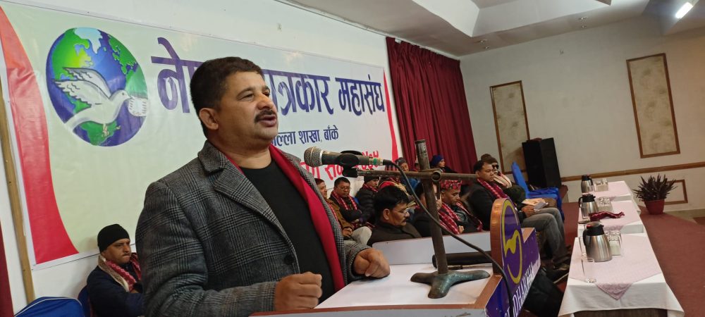 नेपालगन्ज । नेपाल पत्रकार महासङ्घका केन्द्रीय अध्यक्ष विपुल पोख्रेलले प्रेस स्वतन्त्रतामाथि विभिन्न पक्षबाट हुने हस्तक्षेपलाई तत्काल बन्द गर्न सरोकारवाला निकायको ध्यानाकर्षण गराएका छन् ।