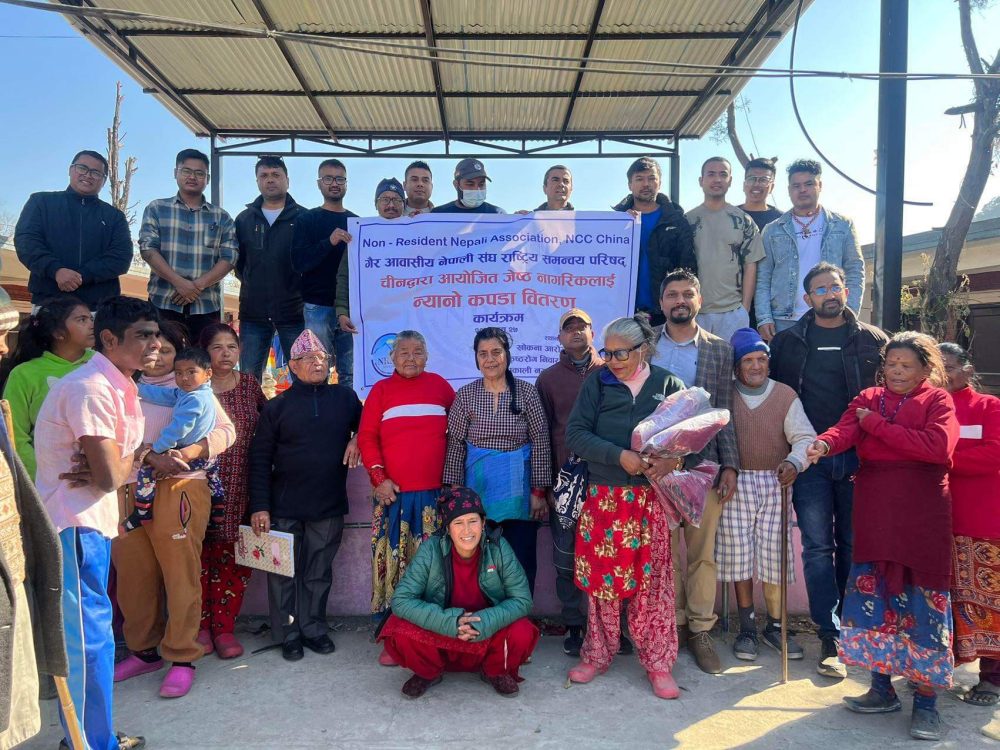 ज्येष्ठ नागरिकलाई न्यानो कपडा वितरण गर्दै एनआरएनए चीनका उपाध्यक्ष निर्मल चौलागाईंले एनआरएनए चीनले नेपाल र नेपालीको लागि विपत्तिदेखि सामाजिक सेवा र जनसचेतना कार्यक्रम गर्दै आएको र त्यसलाई निरन्तर जारी राख्दै जाने बताए ।
