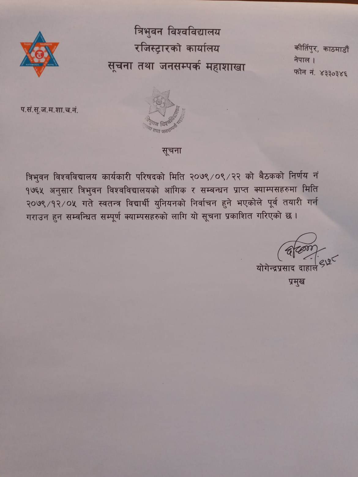 त्रिभुवन विश्वविद्यालय रजिस्ट्रारको कार्यालय सूचना तथा जनसम्पर्क महाशाखाले बिहीबार जारी गरेको सूचनाअनुसार ५ चैतमा त्रिविका आंगिक तथा सम्बन्धन प्राप्त क्याम्पसहरुमा निर्वाचन हुने र यसका लागि तयारी गर्न र गराउन क्याम्पसहरुलाई आग्रह गरिएको छ ।